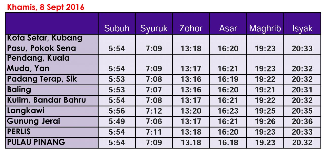 Waktusolatkdh Ps Pp On Twitter Waktu Solat Fardu Seluruh Kedah Perlis Pulau Pinang Khamis 8 Sept 2016 6 Dzulhijjah 1437 Waktusolatkedah Https T Co Qrvhvue6uy Twitter